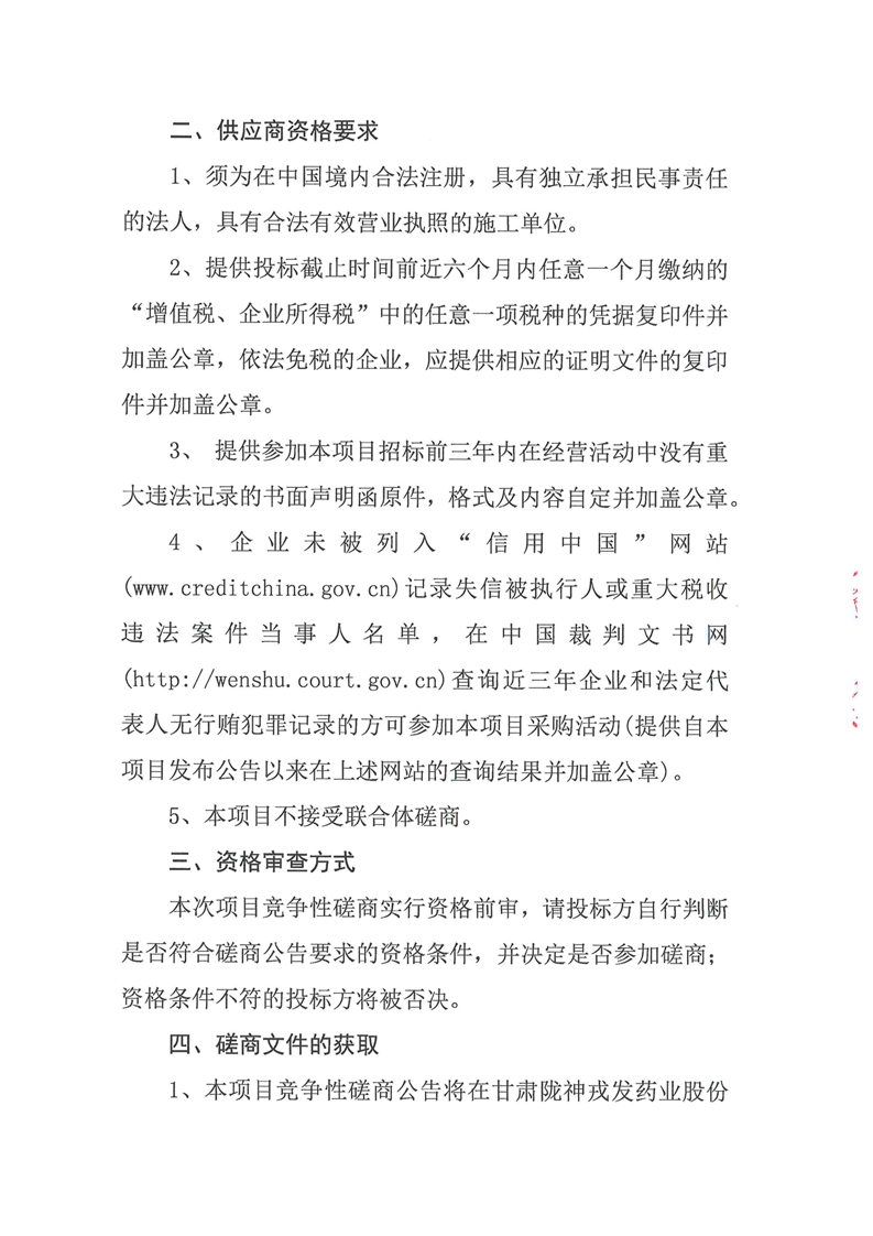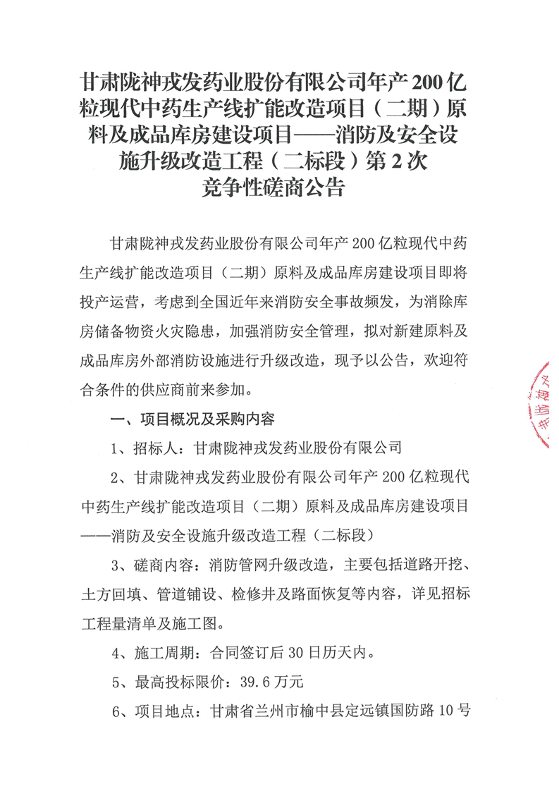 甘肃非凡娱乐药业股份有限公司年产200亿粒现代中药生产线扩能改造项目(二期)原料及成品库房建设项目——消防及安全设施升级改造工程(二标段)第2次