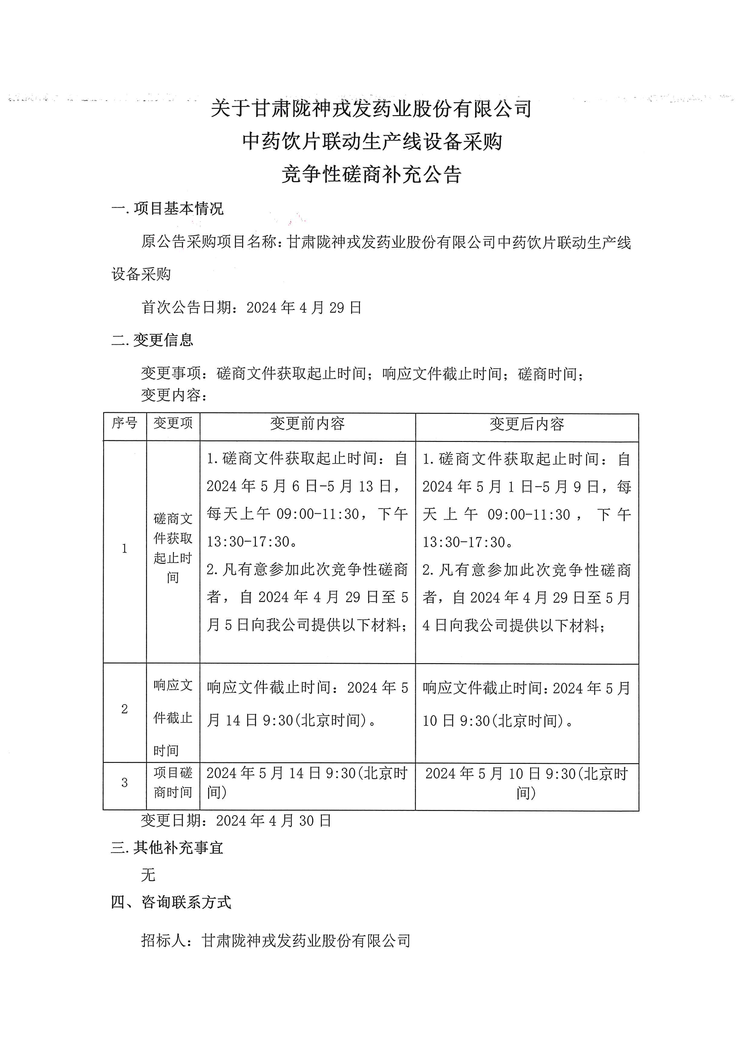 关于甘肃非凡娱乐药业股份有限公司中药饮片联动生产线设备采购竞争性磋商补充公告