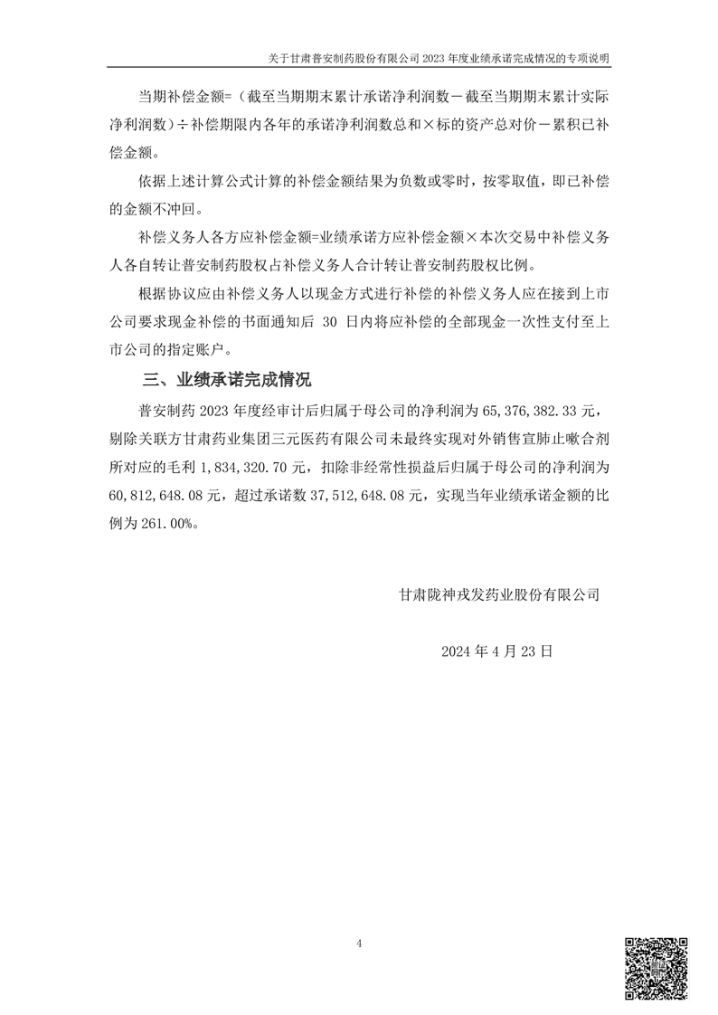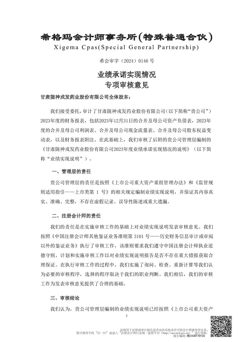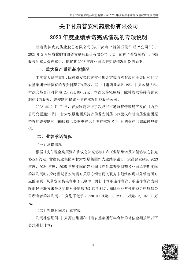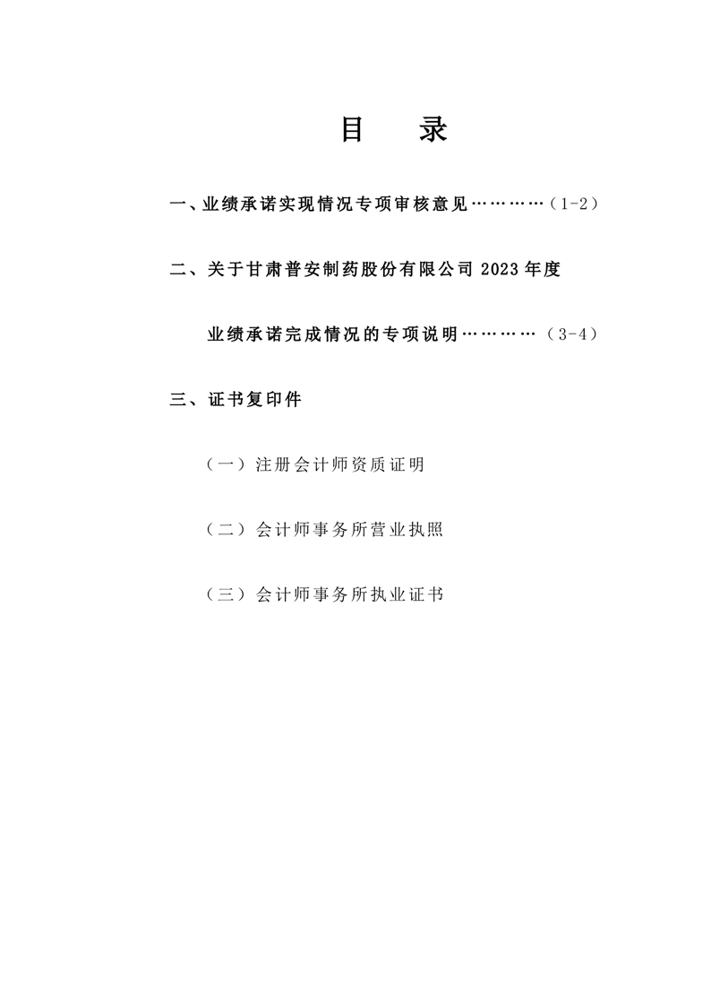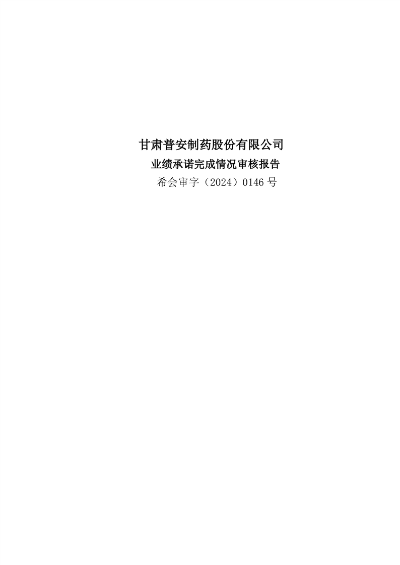 甘肃普安制药股份有限公司业绩承诺完成情况审核报告