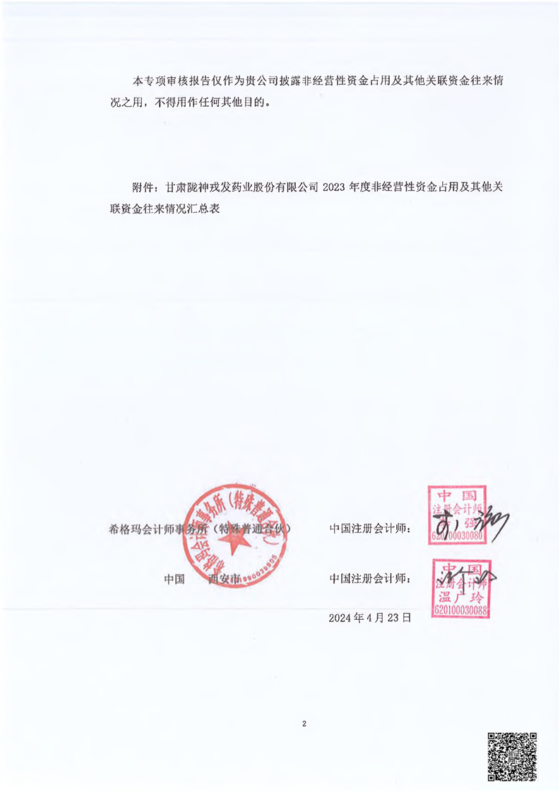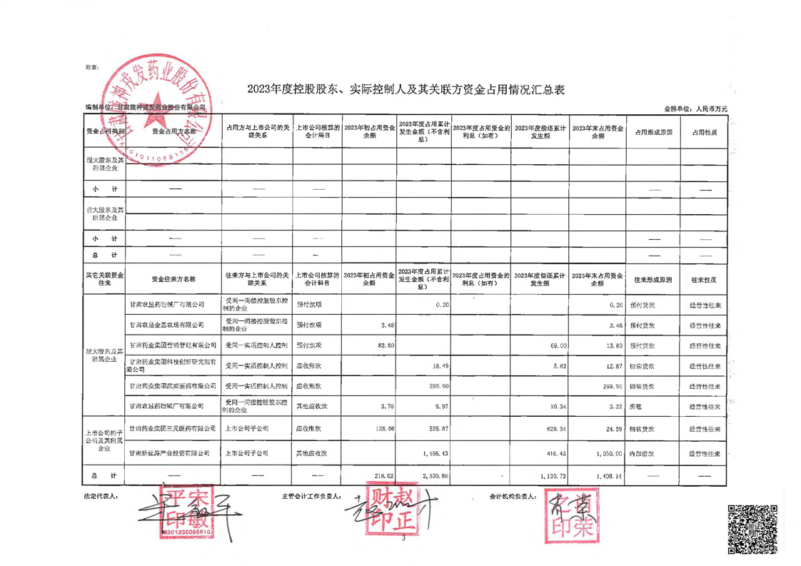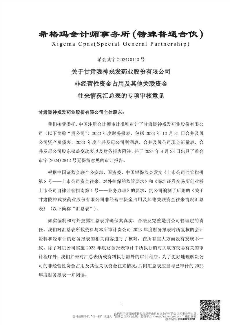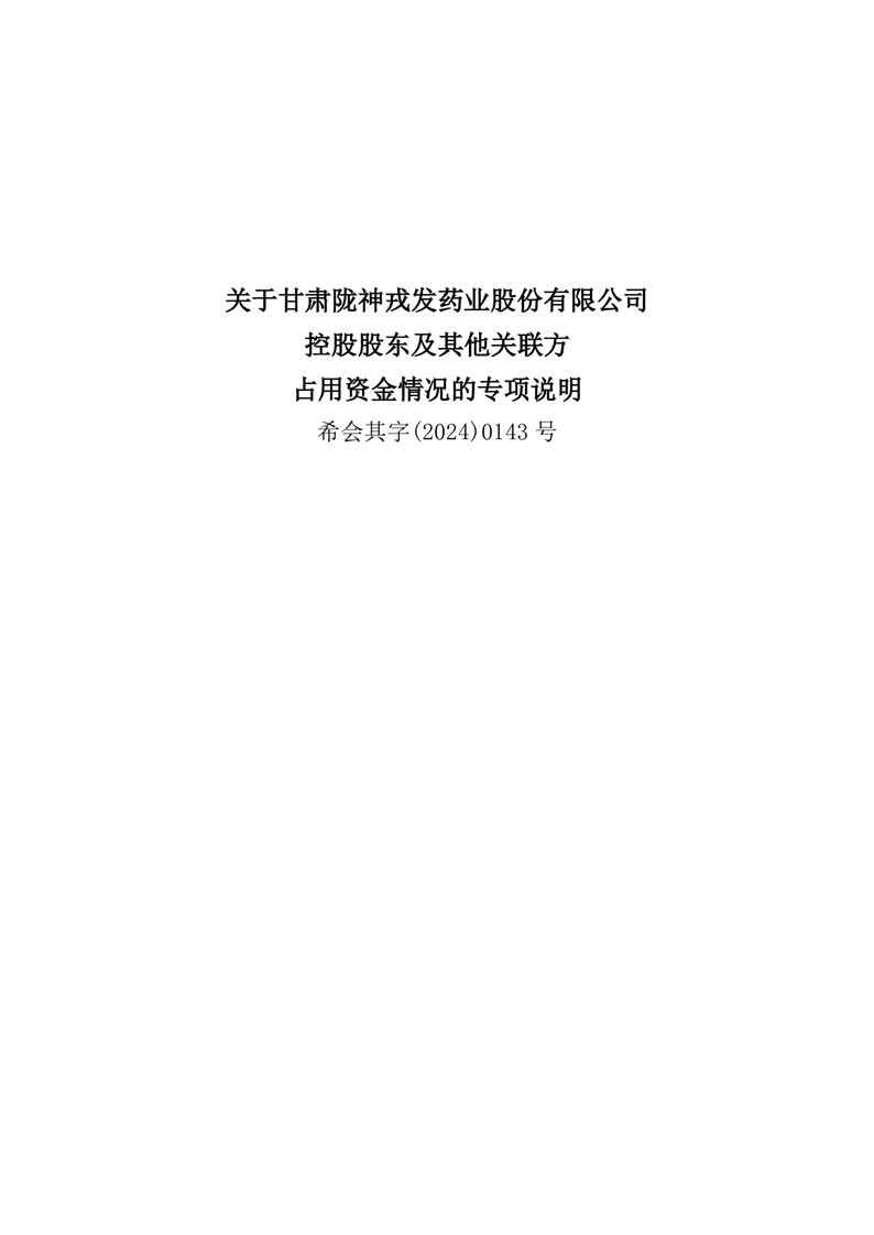 关于甘肃非凡娱乐药业股份有限公司控股股东及其他关联方占用资金情况的专项说明