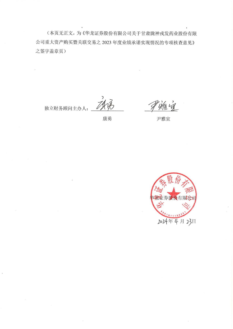 华龙证券股份有限公司关于甘肃非凡娱乐药业股份有限公司重大资产购买暨关联交易之2023年度业绩承诺实现情况的专项核查意见