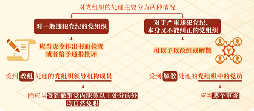 根据《中国共产党纪律处分条例》规定,对党组织的处理主要分为两种情况:对一般违犯党纪的党组织,上级党组织应当责令其作出书面检查或者给予通报批评;对于严重违犯党纪、本身又不能纠正的党组织,上一级党的委员会在查明核实后,根据情节的严重程度,可以予以改组或解散。