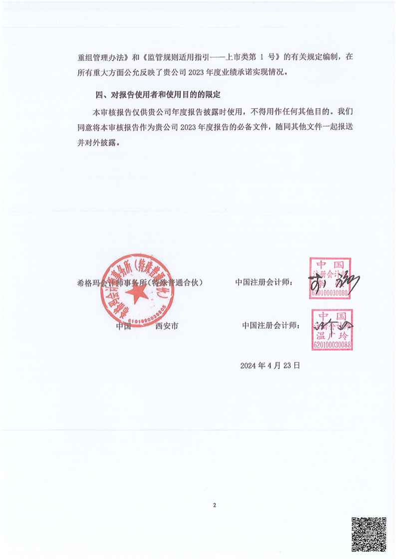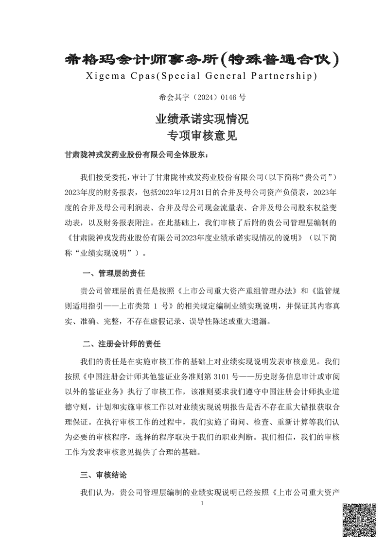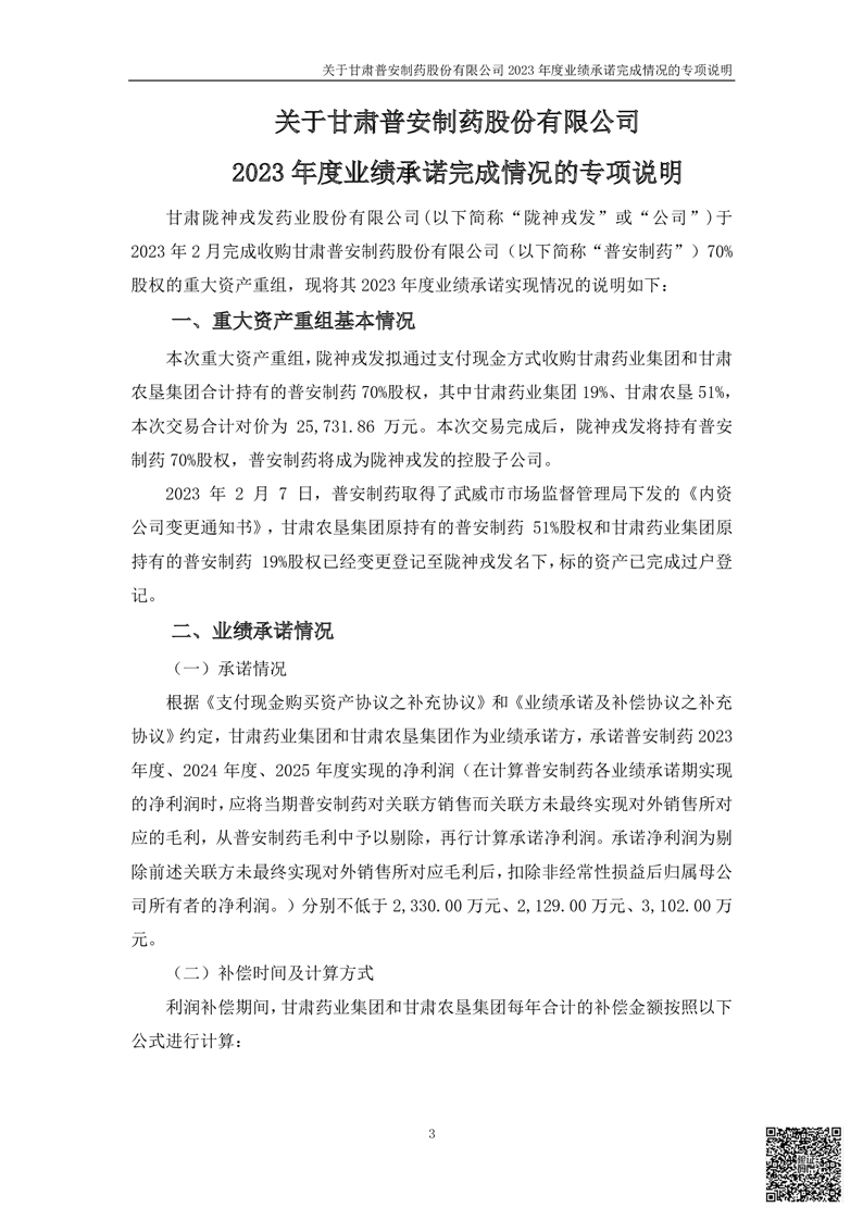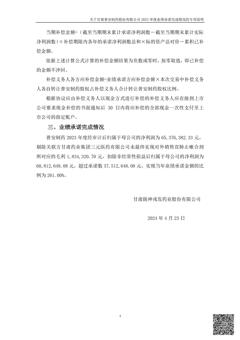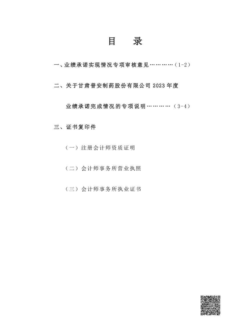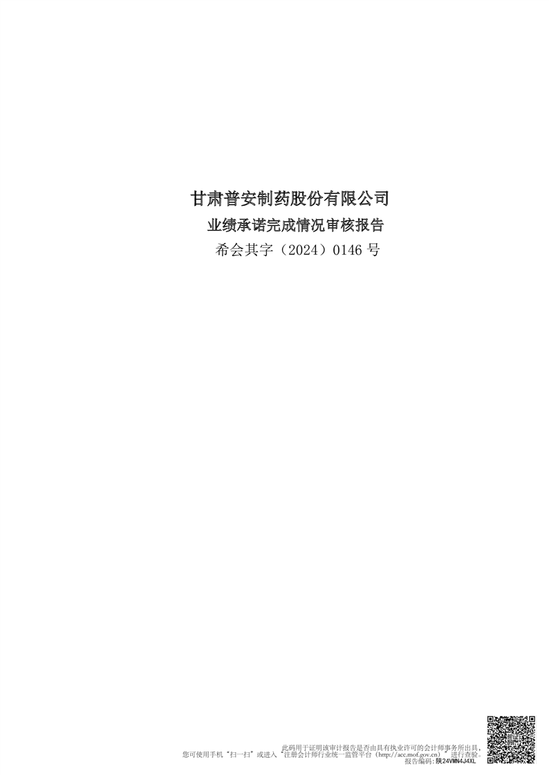 甘肃普安制药股份有限公司业绩承诺完成情况审核报告(更正后)