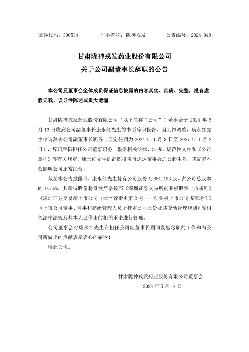 关于公司副董事长辞职的公告