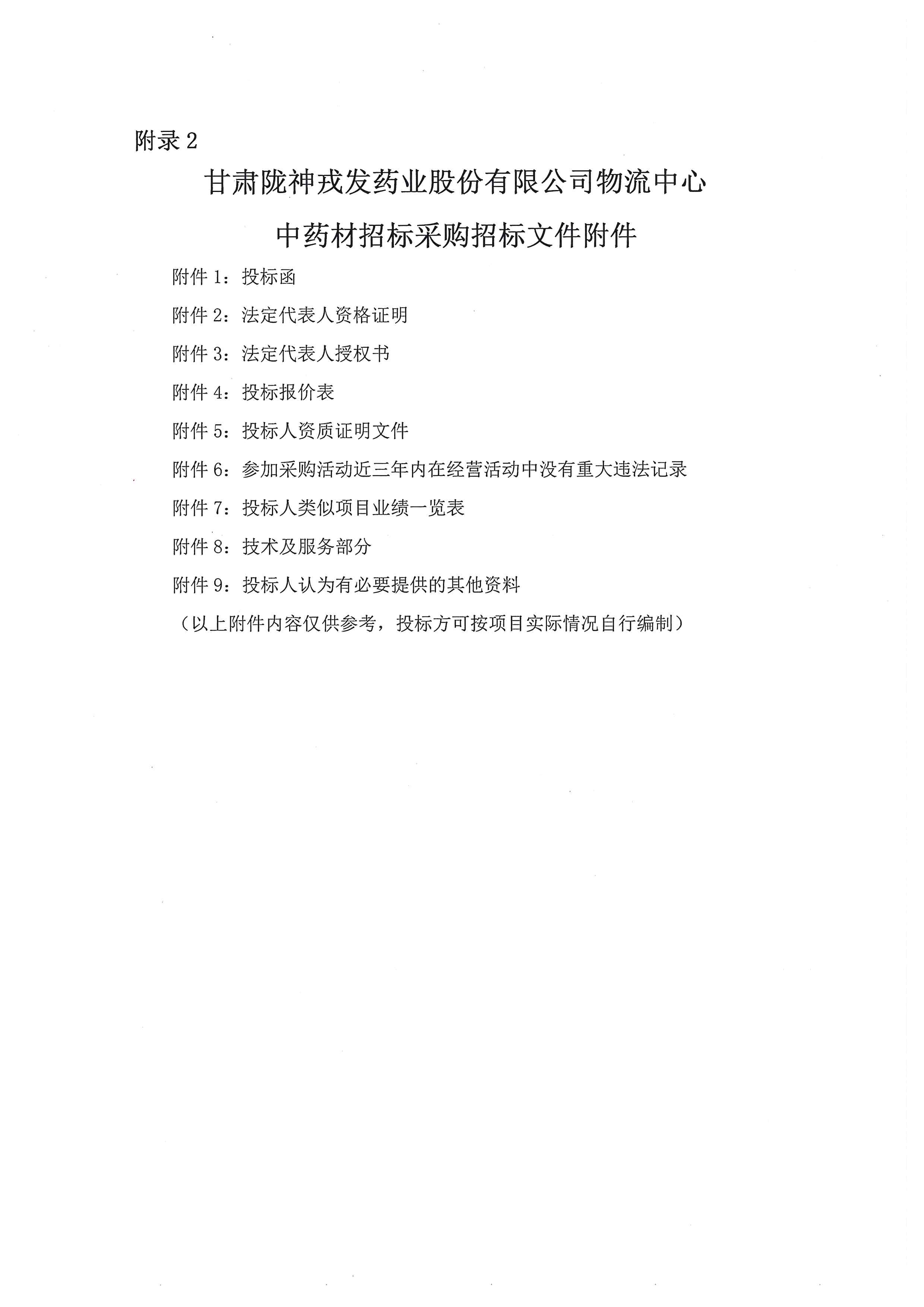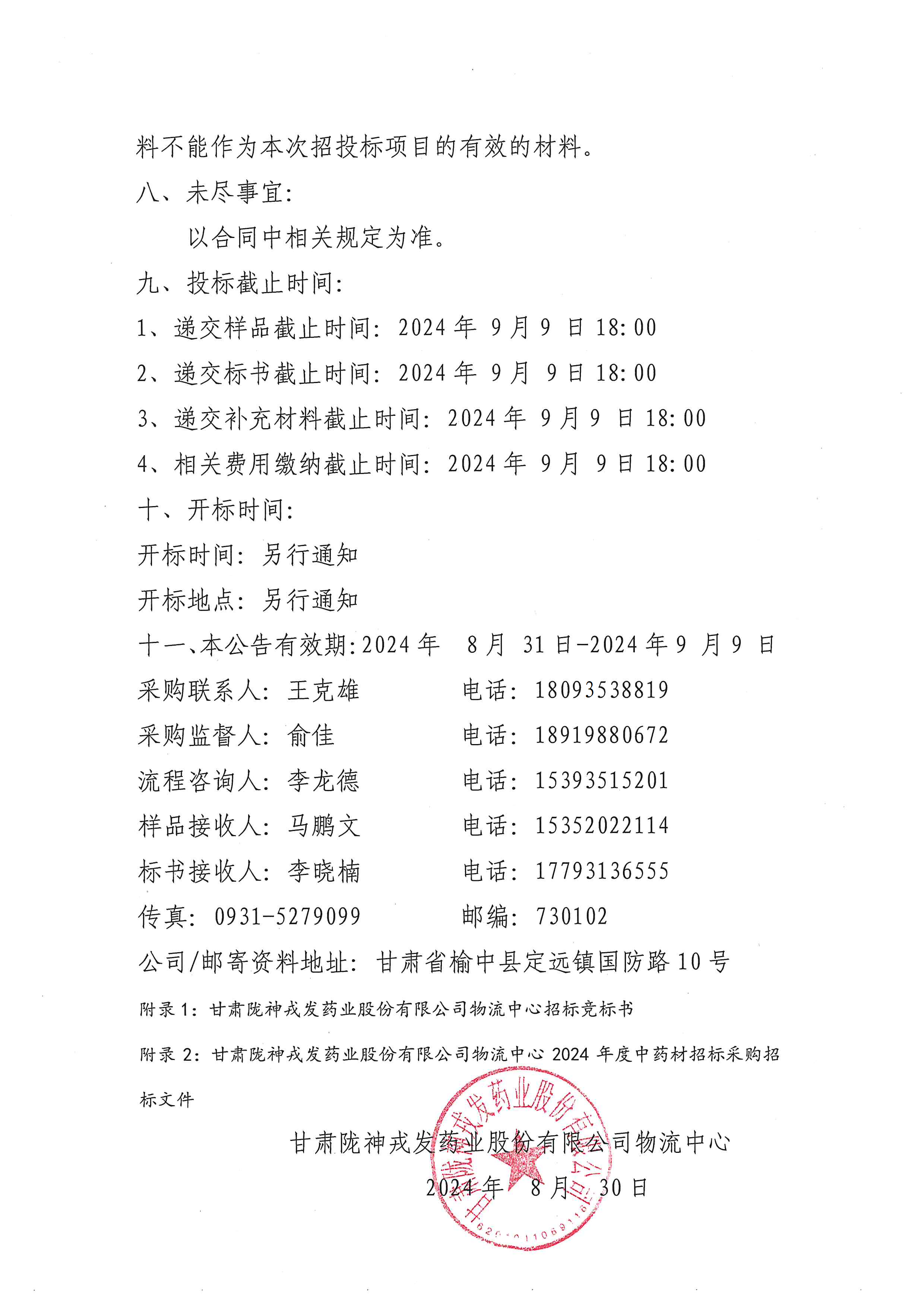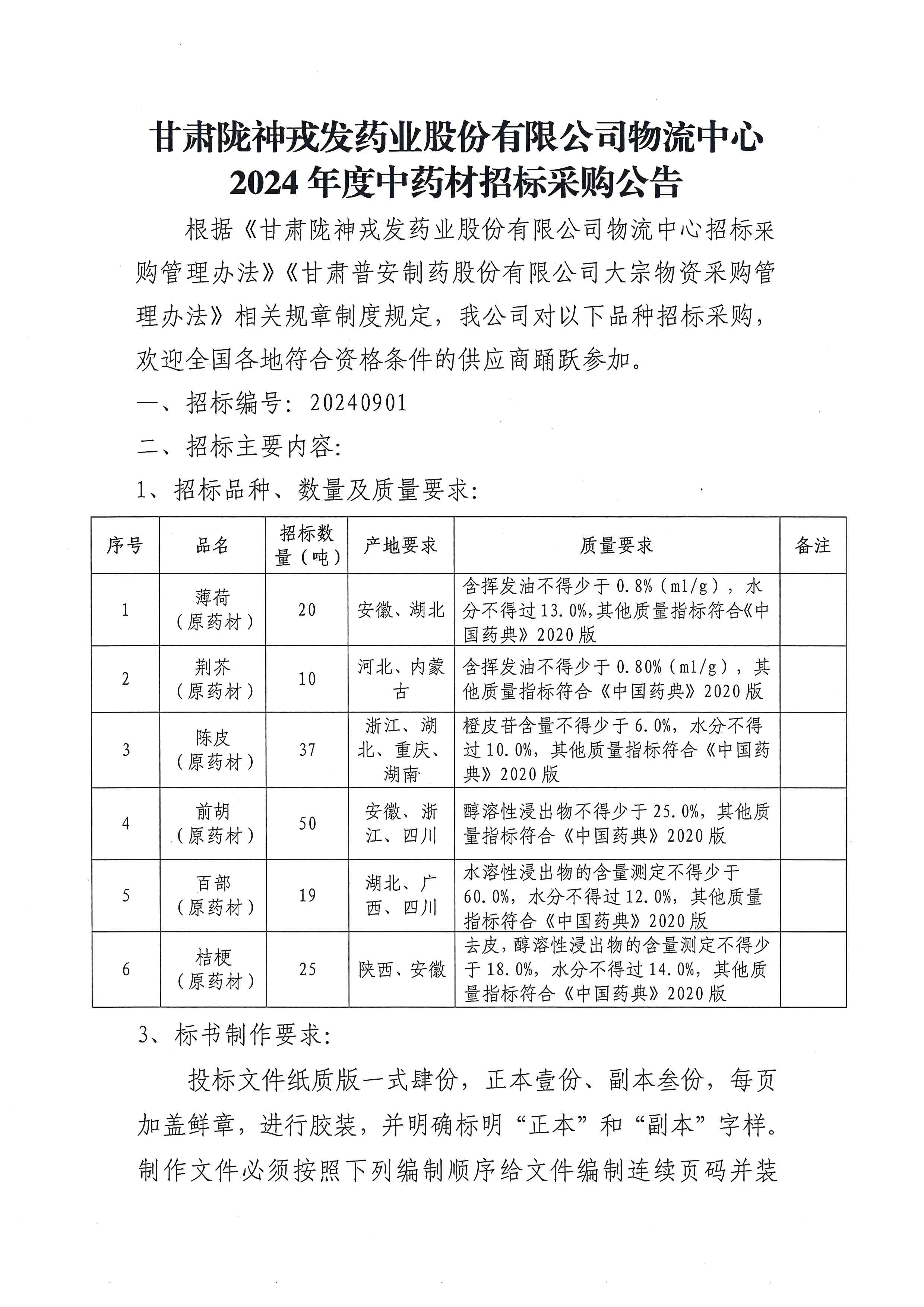 甘肃非凡娱乐药业股份有限公司物流中心2024年度中药材招标采购公告