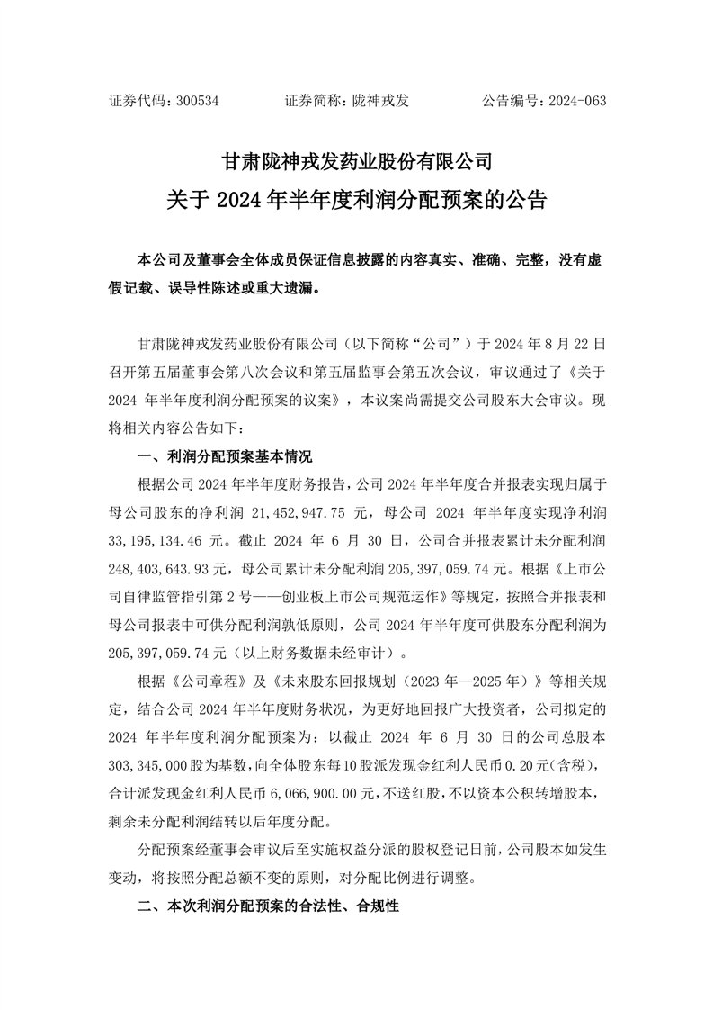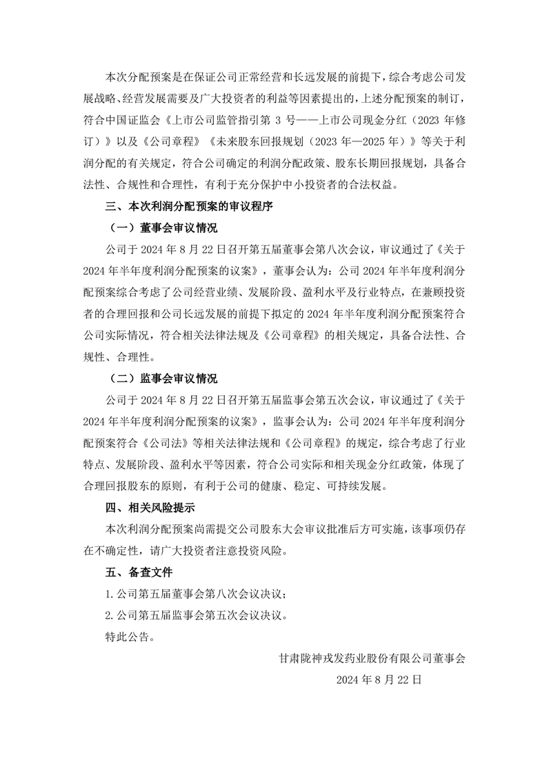 关于2024年半年度利润分配预案的公告