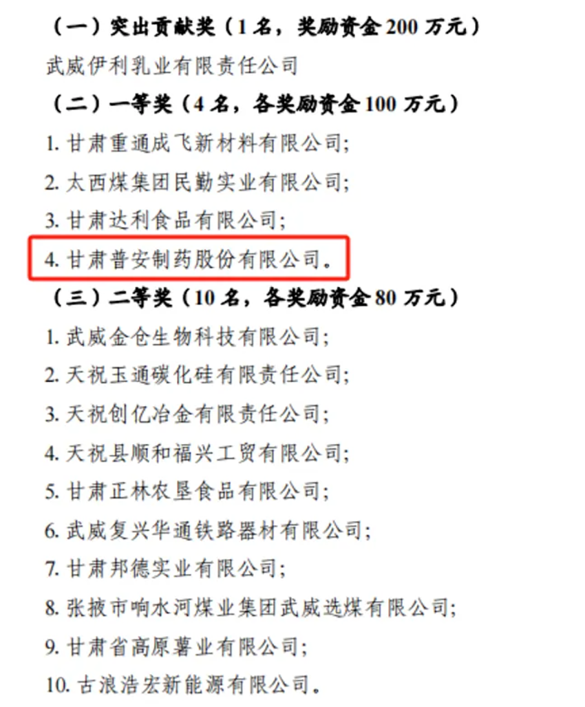 喜报 普安制药荣获“武威市高质量稳增长工业企业一等奖”