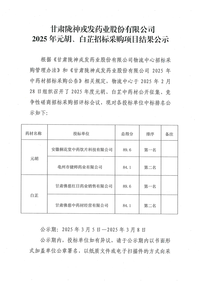甘肃非凡娱乐药业股份有限公司2025年元胡、白芷招标采购项目结果公示