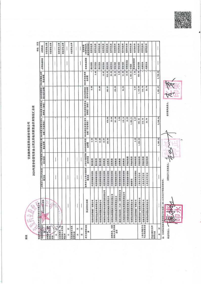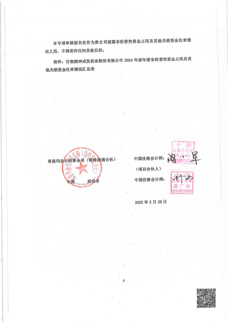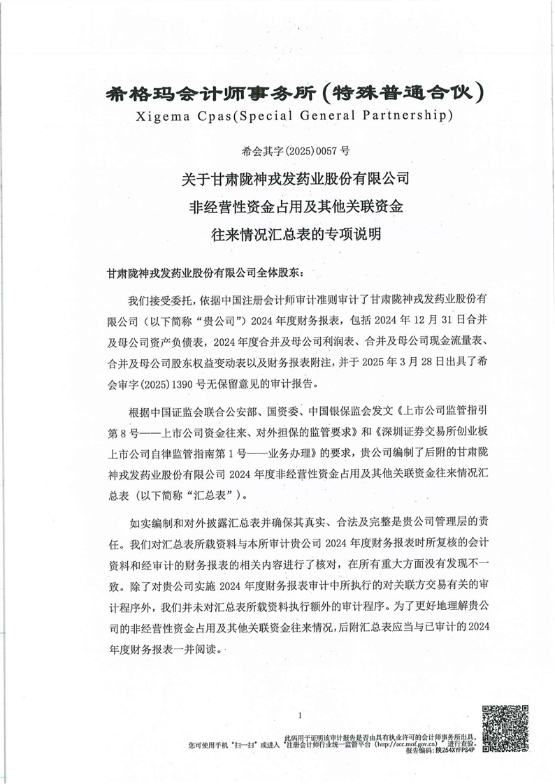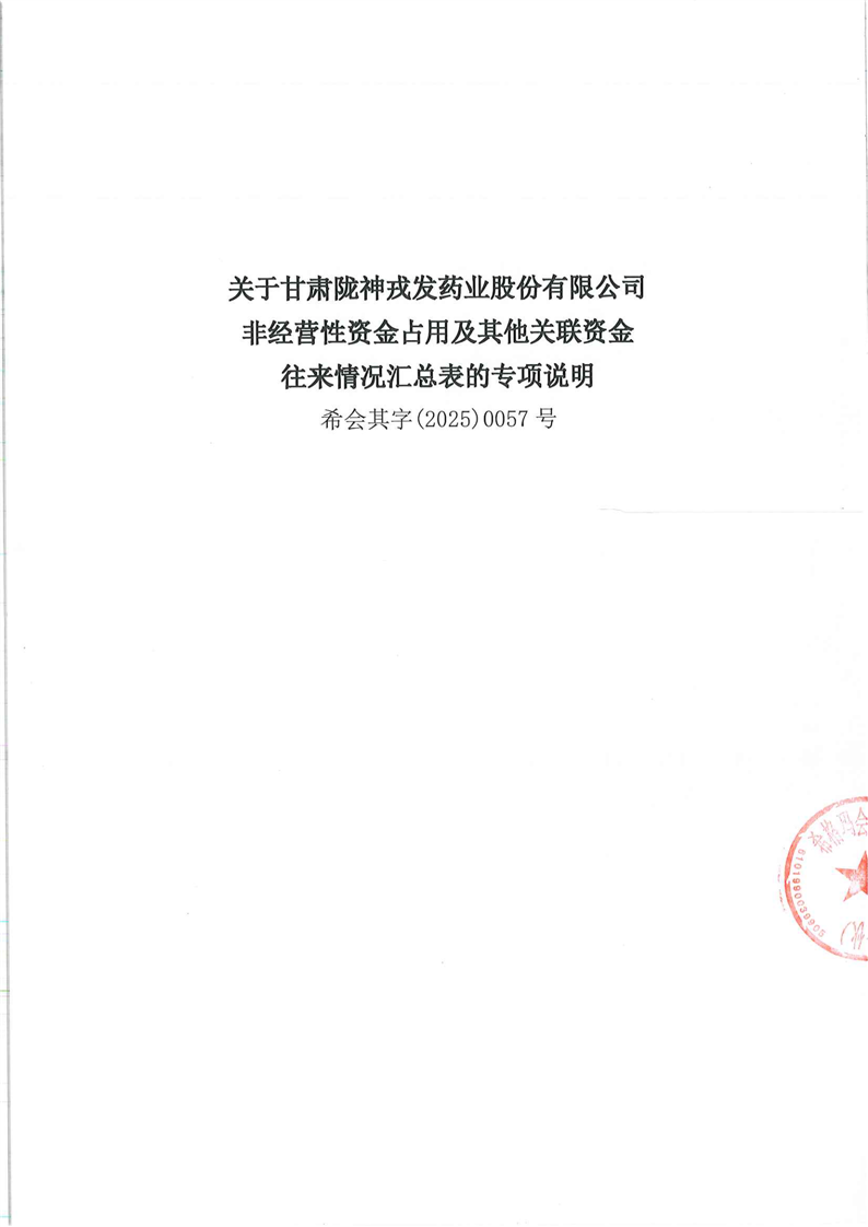 关于甘肃非凡娱乐药业股份有限公司非经营性资金占用及其他关联资金往来情况汇总表的专项说明